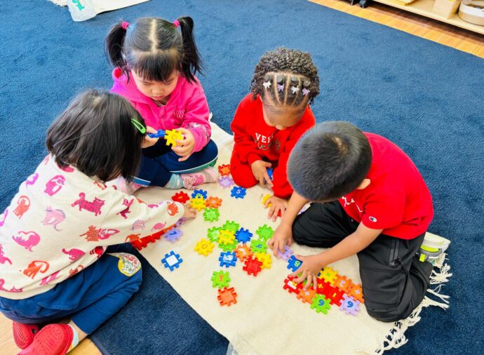 Our classrooms are peaceful, child-centered spaces where students choose activities from open shelves filled with Montessori materials. Children work at tables or floor mats, developing independence, focus, and confidence in a nurturing preschool environment.